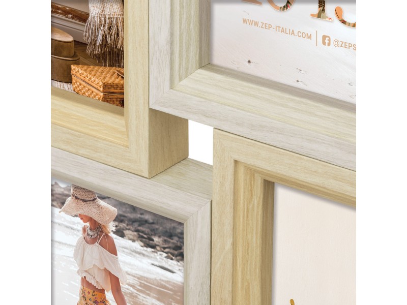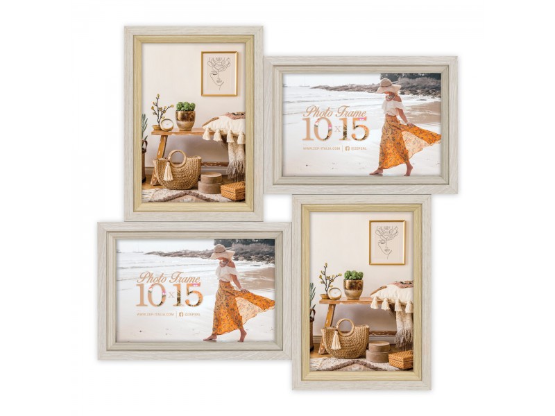 Moldura de madeira Zara 4Q, branca, marrom e cinza, perfil quadrado bicolor, moldura de parede multifotos, composta por molduras horizontais e verticais, para 4 fotos, disponível em vários formatos, adequada para casa e escritório.